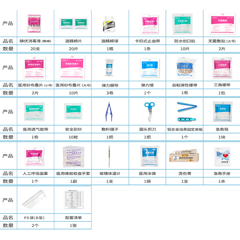 卡扣式止血帶、防水創(chuàng)可貼、無菌敷貼(大號)、醫(yī)用紗布疊片(小號)、醫(yī)用紗布疊片(大號)、彈力繃帶、彈力帽、自粘彈性繃帶、三角繃帶 |