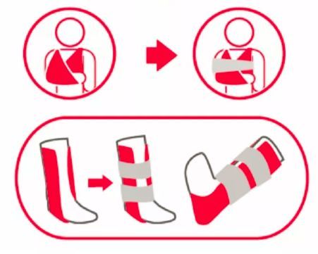 在配置急救包的時候可帶上小的冰袋和彈力繃帶??梢岳蒙磉叡容^堅硬的材料如雜志、樹枝、登山杖等固定骨折處,再利用身邊的材料如頭巾,外套衣服等做懸吊固定以避免二次傷害。