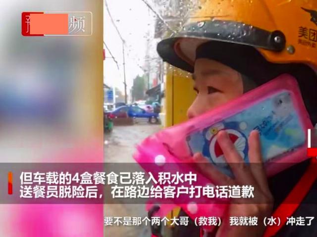 一名女外賣員,在送餐的過程中,騎的車子被水沖倒,路邊的群眾見了,用力把外賣員扶起,但是大水還是沖走了客戶點的餐。當外賣員打電話告訴客人時,客人不僅沒有責怪,還牽掛她的安全;