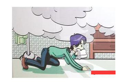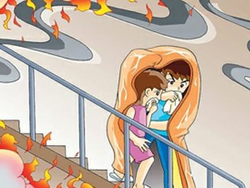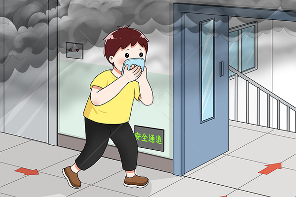 逃生時經(jīng)過充滿煙霧的路線,要防止煙霧中毒、預(yù)防窒息。為了防止火場濃煙嗆入,可采用毛巾、口罩蒙鼻,匍匐撤離的辦法。煙氣較空氣輕而飄于上部,貼近地面撤離是避免煙氣吸入、濾去毒氣的最佳方法。穿過煙火封鎖區(qū),應(yīng)配戴防毒面具、頭盔、阻燃隔熱服等護(hù)具,如果沒有這些護(hù)具,那么可向頭部、身上澆冷水或用濕毛巾、濕棉被、濕毯子等將頭、身裹好,再沖出去。